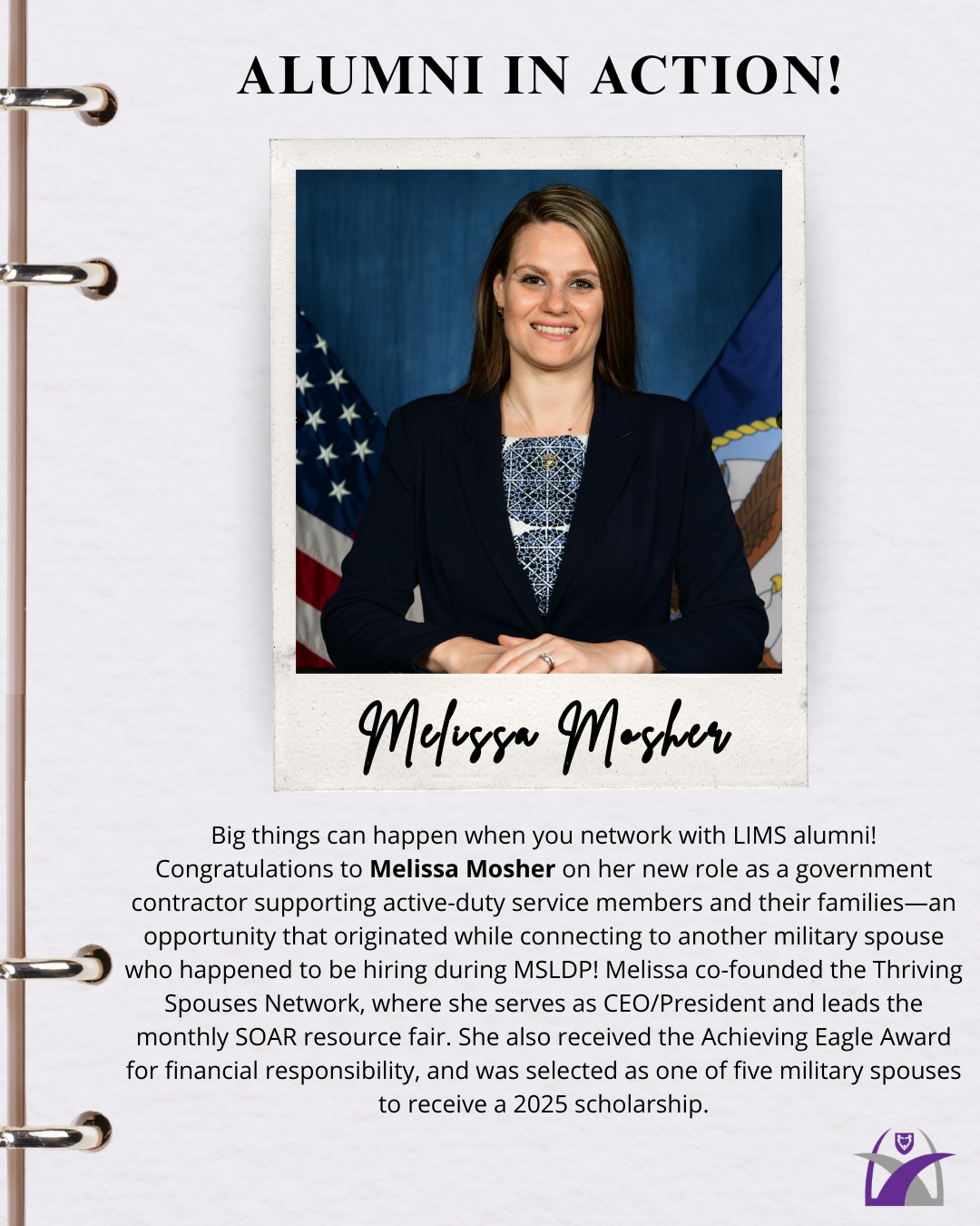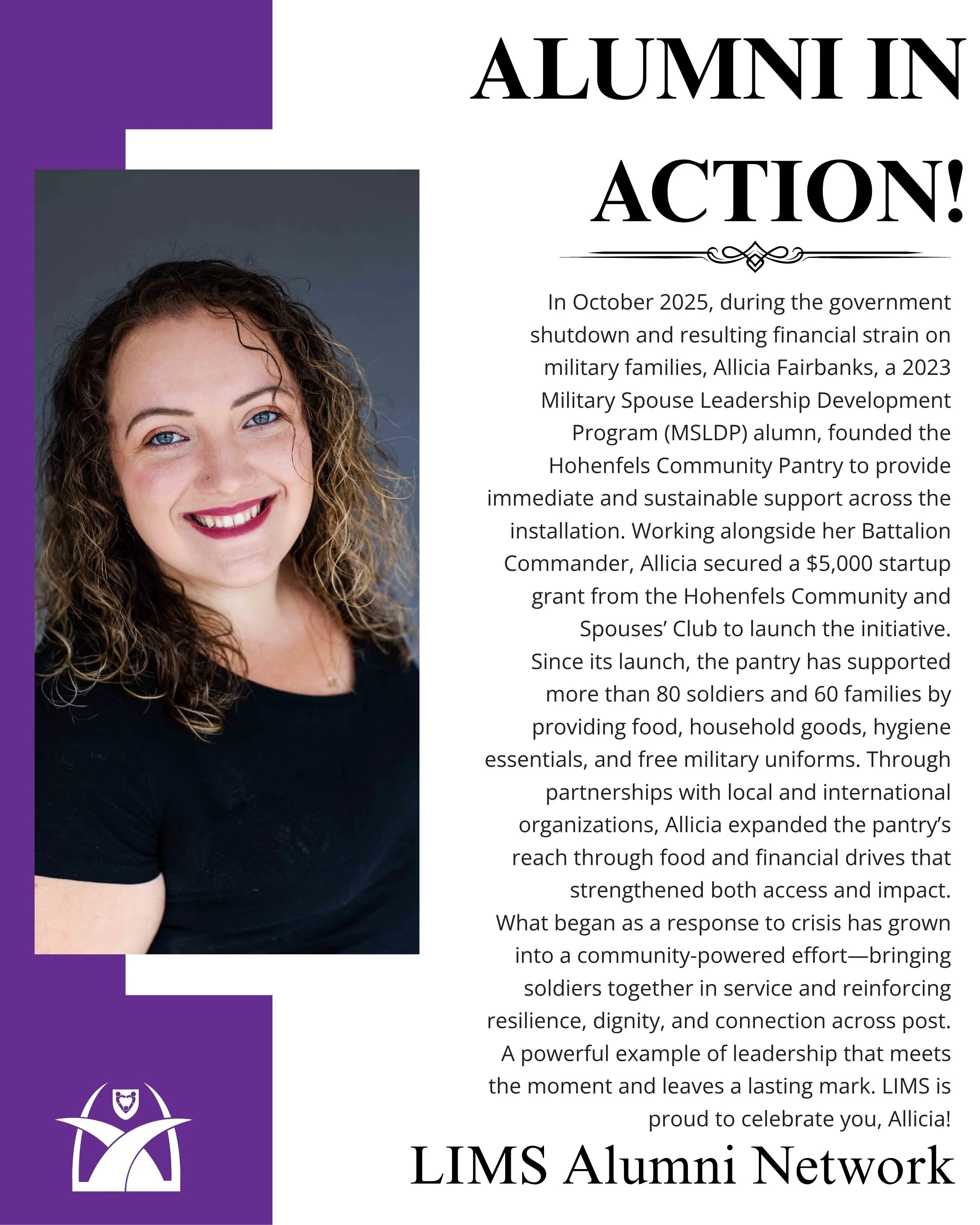 The purpose of the Leadership Institute for Military Spouses’ Alumni Network is to provide ongoing support and resources for military spouses who have completed the Leadership Institute program. It aims to facilitate a strong community where members can share experiences, access professional development opportunities, and network with one another. The network fosters leadership skills and encourages personal and professional growth among military spouses, empowering them to navigate the unique challenges of military life while contributing to their communities. Through events, workshops, and mentorship, the Alumni Network seeks to inspire and equip military spouses to become stronger leaders.